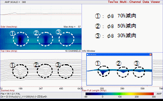 ファルコンJr.でアルミニウムの裏面減肉の探傷が可能であることが確認されました。平成23年11月 に実機アルミニウムタンクの底板(t=10mm)の探傷を実施してファルコンJr.の検出能力の高さを実証しております。試験片を使用した室内探傷を紹介します。