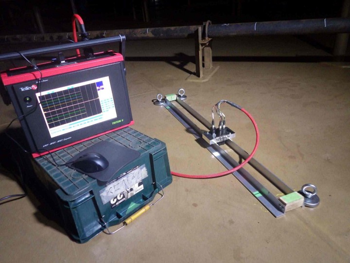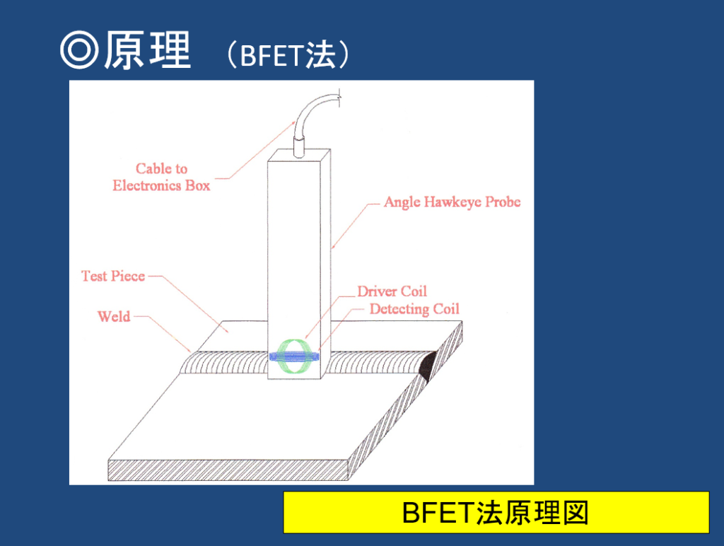 タンク底板溶接部の検査には従来コーティングを除去してMTを実施していましたが、コーティング上から溶接部の渦流探傷をBFET法(Balance Field ET)で行うものです。